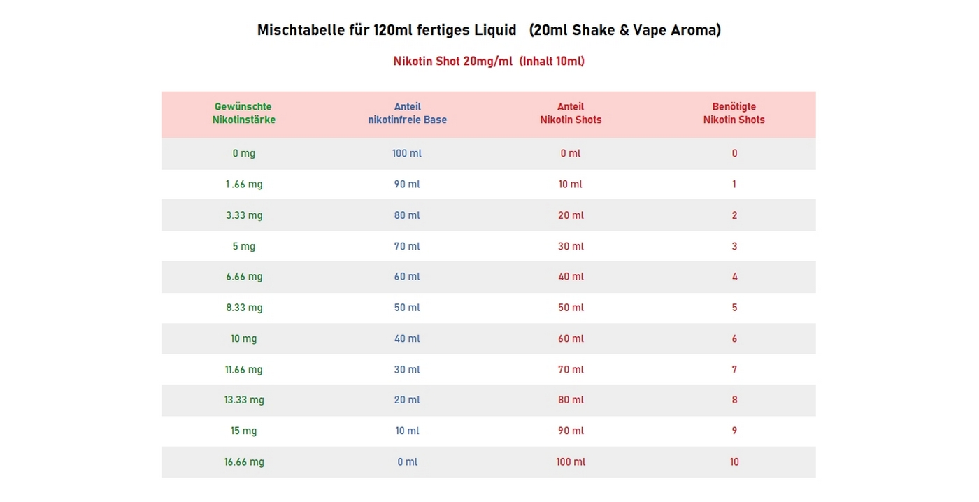 In einer 120ml Chubby Flasche ist das benötigte Aroma (20ml) enthalten, für ein fertiges 120ml Liquid. Einfach die Flasche mit der gewünschten Base oder Nikotinshots auffüllen (siehe Mischtabelle), kräftig schütteln und nach einer empfohlenen Reifezeit von 5 - 10 Tagen ist das Liquid ready to vape! Es wird keine Spritze, Messbecher oder sonstiges Zubehör benötigt.